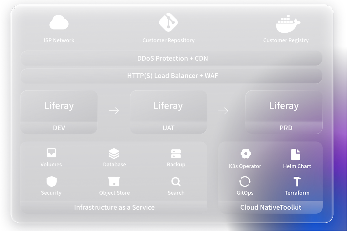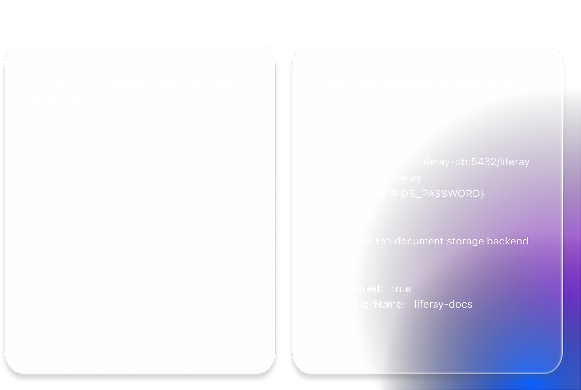 Cloud-Native Tooling ermöglicht es, Liferay DXP in wenigen Minuten auf AWS, Azure oder Google Cloud bereitzustellen – mithilfe von Terraform-Blueprints und Helm-Charts. Diese vorkonfigurierten Tools reduzieren Einrichtungsfehler und richten Lizenzen automatisch nach Ihren Berechtigungen aus, sodass Sie weniger Zeit mit der Infrastruktur verbringen und sich stärker auf die Wertschöpfung konzentrieren können.