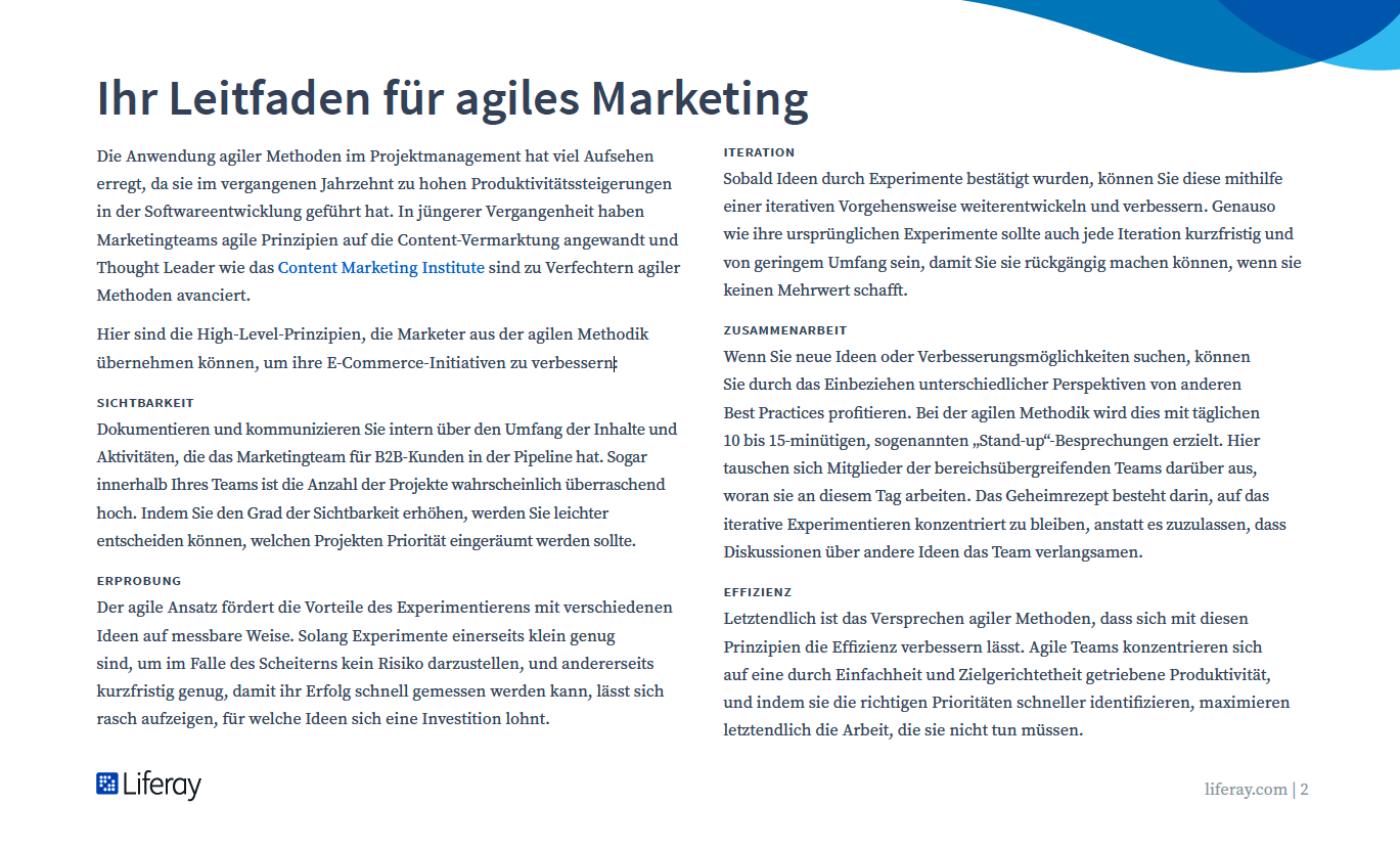 Die Entwicklung eines agilen Kommunikationsansatzes kann die nötige erforderliche Flexibilität bieten, um kritische Informationen sofort zu aktualisieren. In diesem Ebook erfahren Sie, was Marketingexperten aus der Agilen Methodik entnehmen können, um ihre E-Commerce-Initiativen zu verbessern.