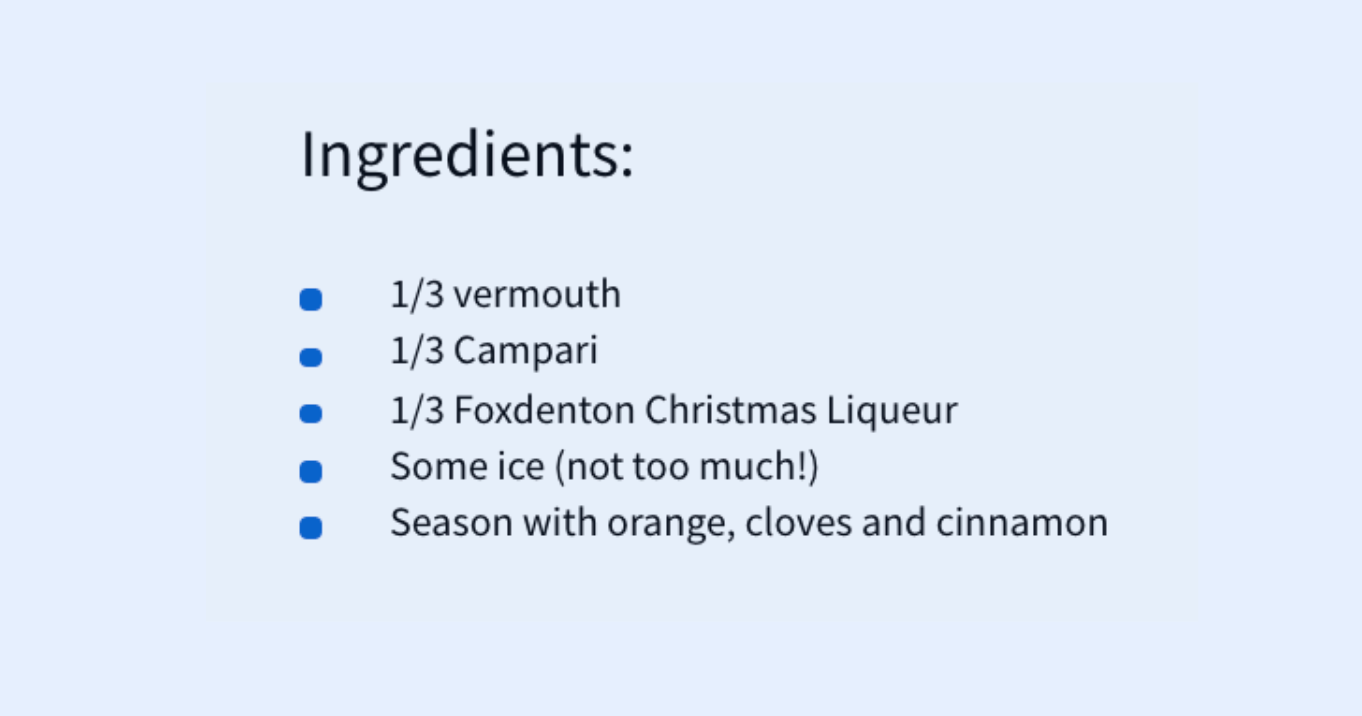- Mix together the vermouth, campari and the foxdenton liqueur
