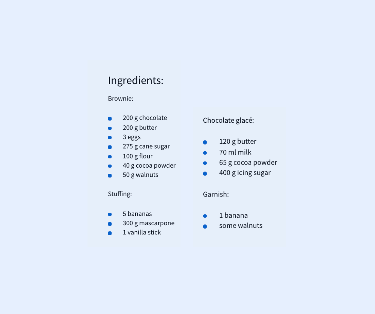 Cut the brownie sandwich in the size you like. Place them on an oven rack and cover with the chocolate glaze. Peel and slice the banana for garnish. Place a slice of banana and a walnut on each brownie.